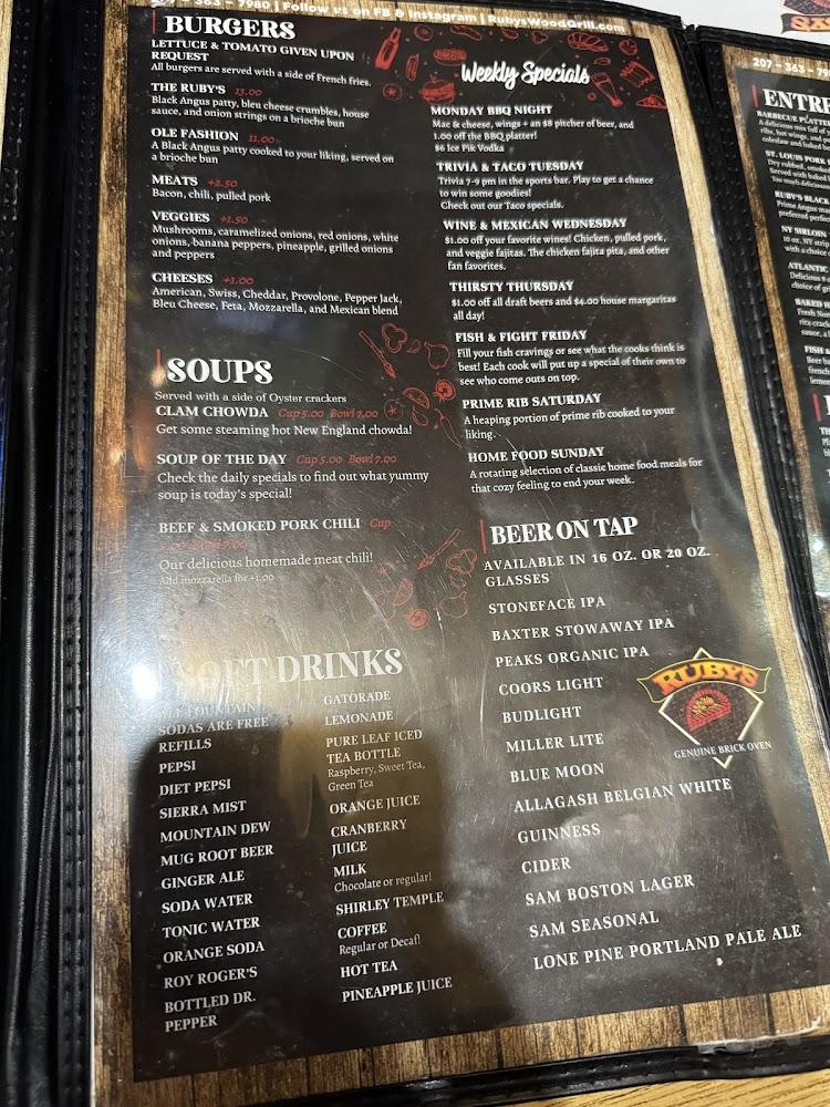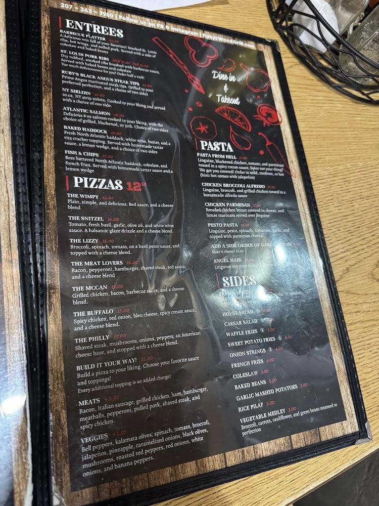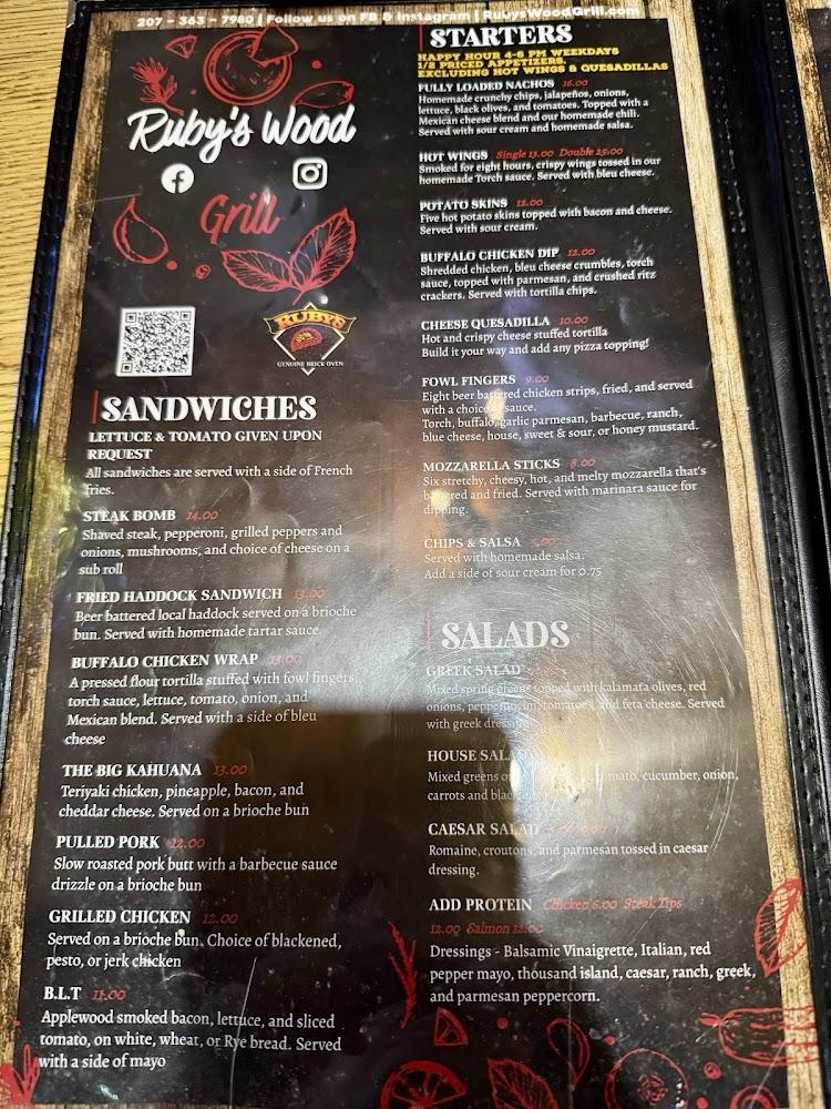 Welcome to Ruby's Wood Grill, your go-to dining spot in York, ME, where American cuisine meets a vibrant atmosphere. Nestled at 433 US-1, our restaurant features a cozy fireplace, outdoor terrace, and live music, perfect for a casual lunch or dinner. Indulge in our extensive menu of local specialties, wood-fired pizzas, and a wide selection of beers and cocktails. We offer takeout, delivery, and a welcoming environment for solo diners. With wheelchair accessibility and happy hour specials, Ruby's is designed for everyone to enjoy delicious food in a relaxed setting. Come experience the warmth and flavor at Ruby's Wood Grill!